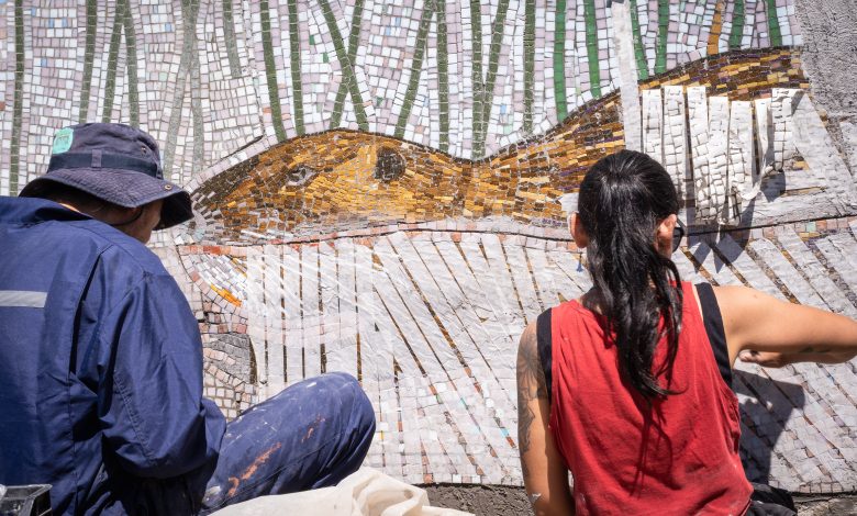 Con todos los materiales producidos en los talleres —dibujos, notas, fotografías y registros de especies— la Colectiva elaboró dos bosquejos que guiaron la creación final: un mural de mosaico en vidrio de 20 m² armado en el taller de los muralistas y luego instalado por partes en la pared de una escalera de la costanera.